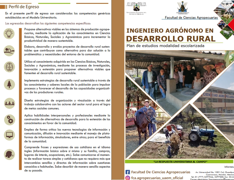 Entre las instituciones públicas en el estado o en los alrededores que están en condiciones de incorporar a los egresados del Plan de estudios del Ingeniero Agrónomo en Desarrollo Rural son las siguientes: Secretaría de Desarrollo Agropecuario (SEDAGRO), Secretaría de Agricultura y Desarrollo Rural (SADER), Comisión Nacional Forestal (CONAFOR), Instituto Nacional de Investigaciones Forestales, Agrícolas y Pecuarias (INIFAP), Instituto Mexicano de Tecnología del Agua (IMTA), Comisión Nacional del Agua (CONAGUA), Secretaría de Desarrollo Agrario, Territorial y Urbano (SEDATU), Secretaría de Bienestar (BIENESTAR), Centro Nacional de Parasitología Animal (CENAPA), Secretaria de Desarrollo Sustentable (SDS), Secretaría del Medio Ambiente y Recursos Naturales (SEMARNAT), Comité Estatal de Sanidad Vegetal del Estado de Morelos (CESVMOR), Comité Estatal de Sanidad Acuícola del Estado de Morelos (CESAEM), Centro de Apoyo al Desarrollo Rural (CADER), Universidad Autónoma del Estado de Morelos (UAEM), Dirección General de Educación Tecnológica Agropecuaria (DGETA), Secretaría de Educación Pública (SEP), Fideicomisos Instituidos en Relación a la Agricultura (FIRA), Fideicomisos de Riesgo Compartido (FIRCO), Sistemas Producto (SP), Organización de las Naciones Unidas para la Agricultura y la Alimentación (FAO), Registro Agrario Nacional (RAN) y Procuraduría Agraria (PA), Sistema de Agua Potable y Alcantarillado del Municipio de Cuernavaca (SAPAC). Dentro del sector privado también se contemplan: Comercializadora Nacionales de Plantas Ornamentales (CONAPLOR), Consejo Estatal de Productores de Ornamentales del Estado de Morelos (CEPOMAC), Plántulas de Tetela, Plantec, Tahí Bioplant, Viveros Yautepec, Comercializadora Agropecuaria (COMAGRO), Beta San Miguel (BSM), Asociación Mexicana para el Desarrollo Rural, Asociación Guanajuatense para el Desarrollo Rural, A.C., Red Campo y Sierra de Segura.