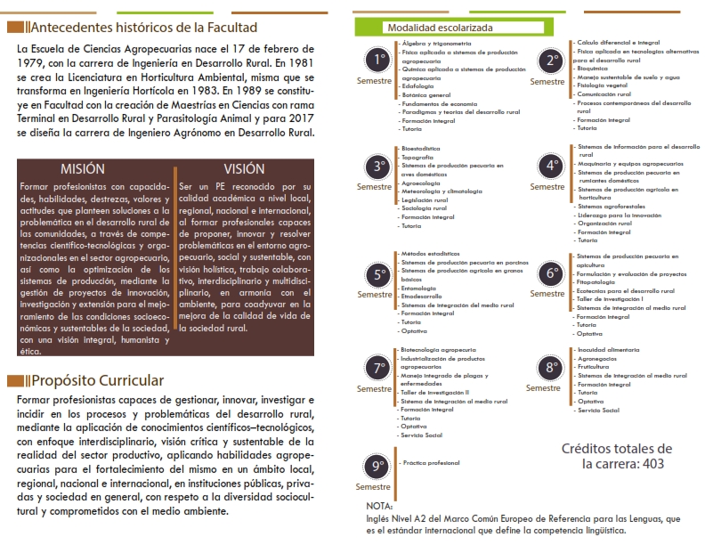 Formar profesionistas con capacidades, habilidades, destrezas, valores y actitudes que planteen soluciones a la problemática en el desarrollo rural de las comunidades, a través de competencias científico-tecnológicas y organizacionales en el sector agropecuario, así como la optimización de los sistemas de producción, mediante la gestión de proyectos de innovación, investigación y extensión para el mejoramiento de las condiciones socioeconómicas y sustentables de la sociedad, con una visión integral, humanista y ética.