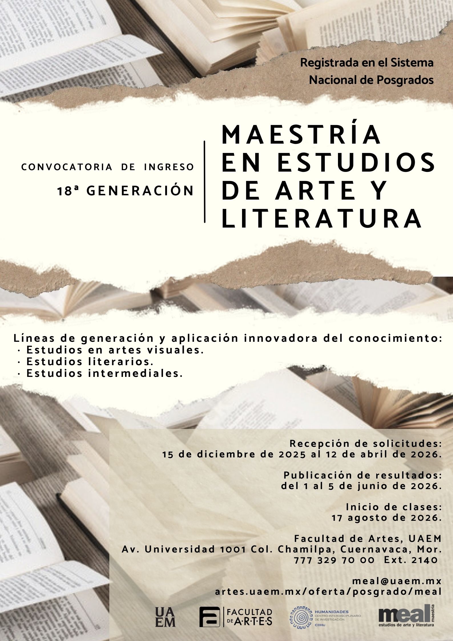 La Maestría en Estudios de Arte y Literatura (MEAL) se distingue por su carácter multidisciplinario, al articular tres Líneas de Generación y Aplicación del Conocimiento (LGAC): Estudios sobre las Artes Visuales, Estudios Literarios y Estudios Intermediales. Mientras las dos primeras se enfocan en los géneros narrativos y poéticos, así como en las artes de la imagen fija y en movimiento (pintura, fotografía, cine, medios múltiples), la tercera LGAC explora los cruces, diálogos y tensiones entre estos campos, con especial atención a sus vínculos con problemáticas socioculturales específicas. El programa fomenta el análisis histórico, teórico y metodológico de los fenómenos artísticos y literarios, privilegiando un enfoque crítico y contemporáneo, con especial énfasis en los procesos culturales y creativos de América Latina, sin excluir aproximaciones comparativas con otras geografías.