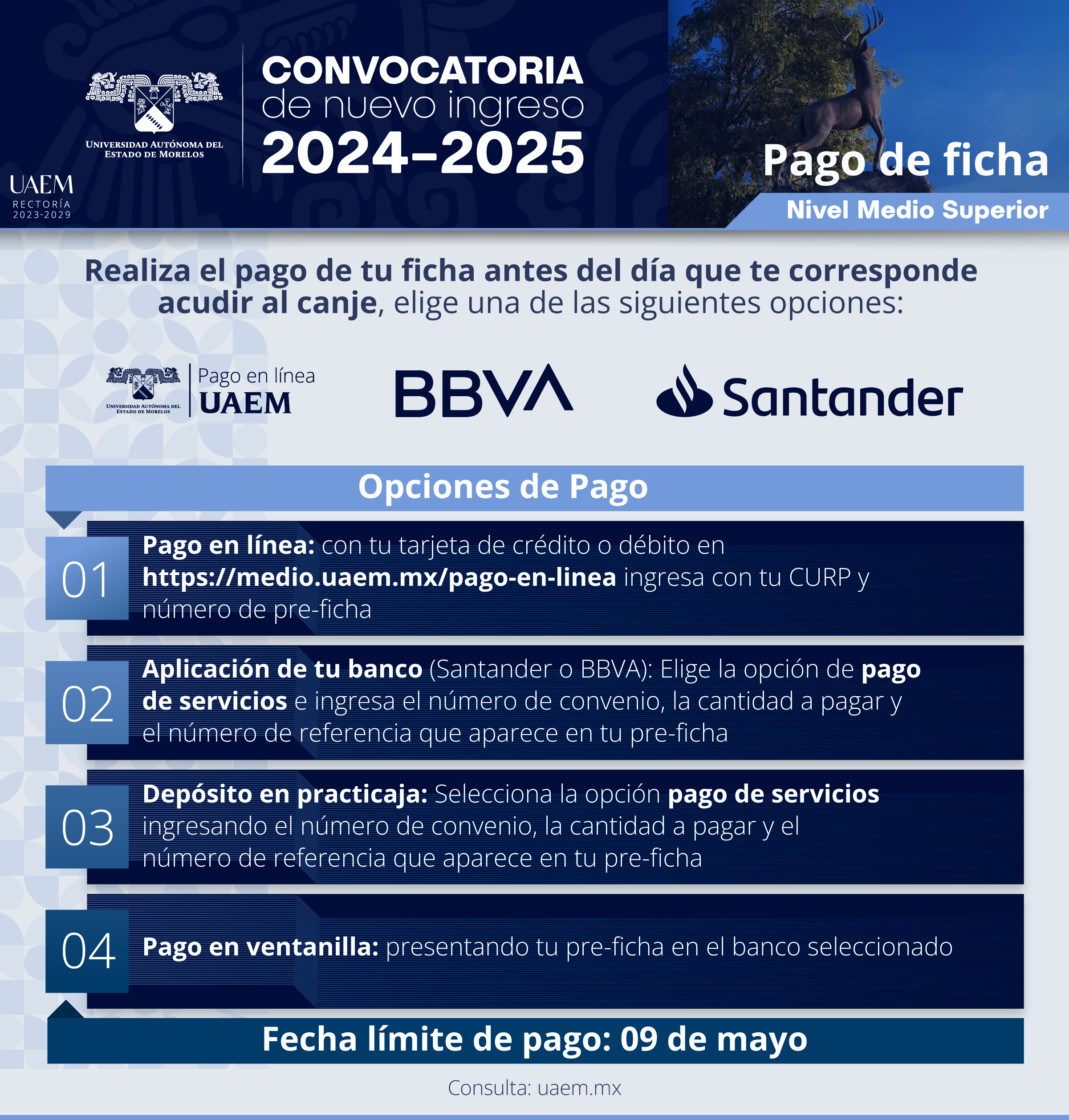 Una vez efectuado el pago, la UAEM no podrá hacer devoluciones, siendo responsabilidad de la persona aspirante completar el trámite dentro de las fechas y horarios establecidos en la presente convocatoria.