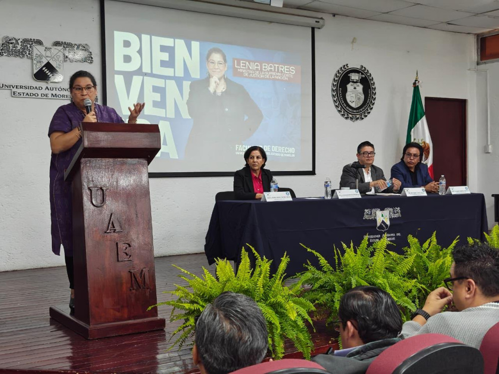 La ministra de la Suprema Corte de Justicia de la Nación (SCJN), Lenia Batres Guadarrama, asistió hoy a la Facultad de Derecho y Ciencias Sociales (FDyCS) de la Universidad Autónoma del Estado de Morelos (UAEM), donde impartió la conferencia "Cuando la comunidad construye justicia".