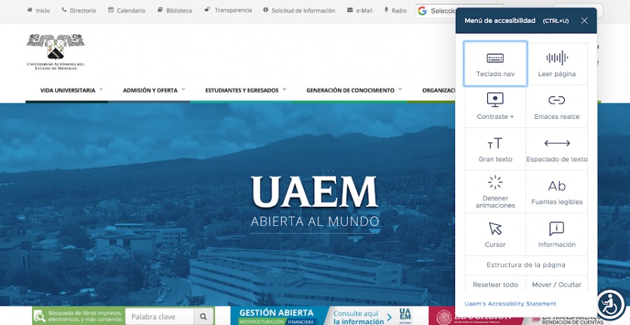 Con el objetivo que el sitio web de la Universidad Autónoma del Estado de Morelos (UAEM) sea accesible para todos los usuarios, a partir del 4 de octubre se instaló en el extremo inferior derecho de la página: www.uaem.mx, el botón que indica diferentes acciones para personas con discapacidad.