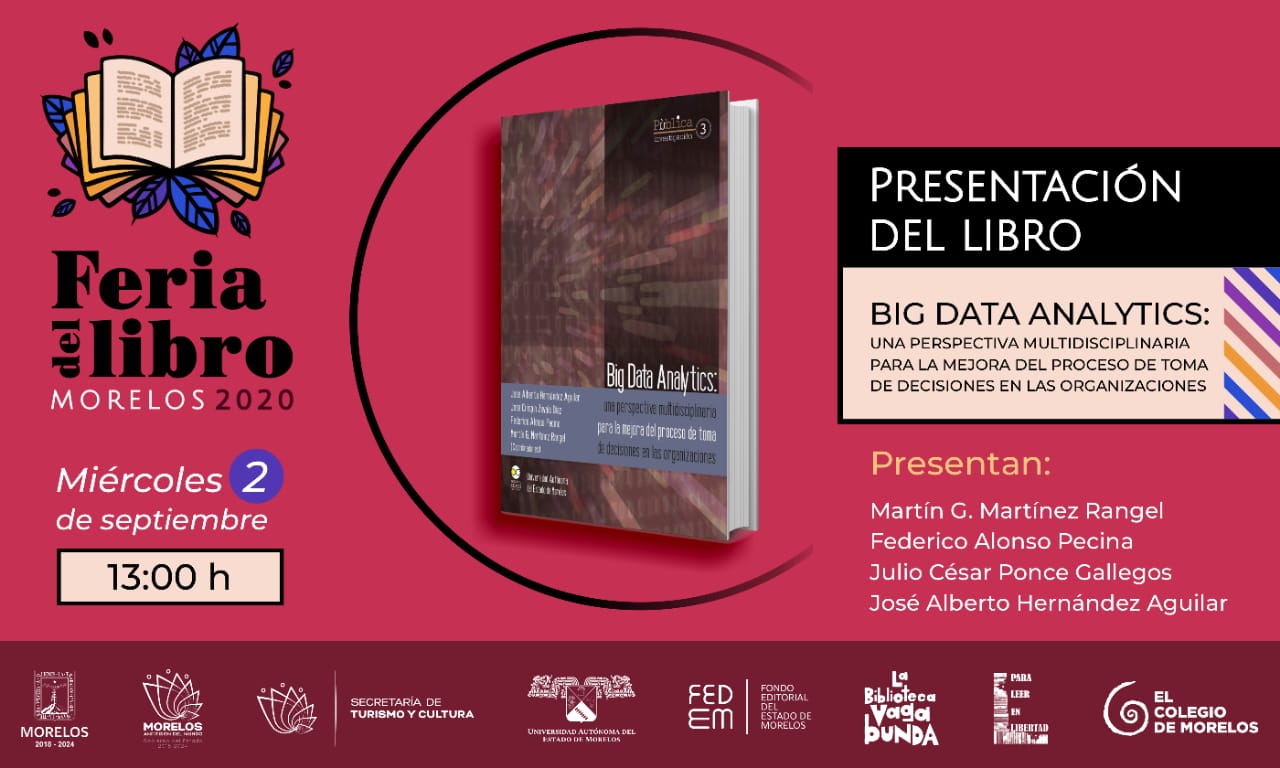 La Facultad de Contaduría, Administración e Informática tiene el honor de invitarle a la presentación del libro “Big Data Analytics: Una perspectiva multidisciplinaria para la mejora del proceso de toma de decisiones en las organizaciones” de los autores Dr. José Alberto Hernández Aguilar; Dr. José Crispín Zavala Díaz, Dr. Federico Alonso Pecina, Dr. Martín G. Martínez Rangel, quienes son profesores investigadores y catedráticos de esta Unidad Académica; que se llevara a cabo en la Feria del Libro Morelos 2020.
