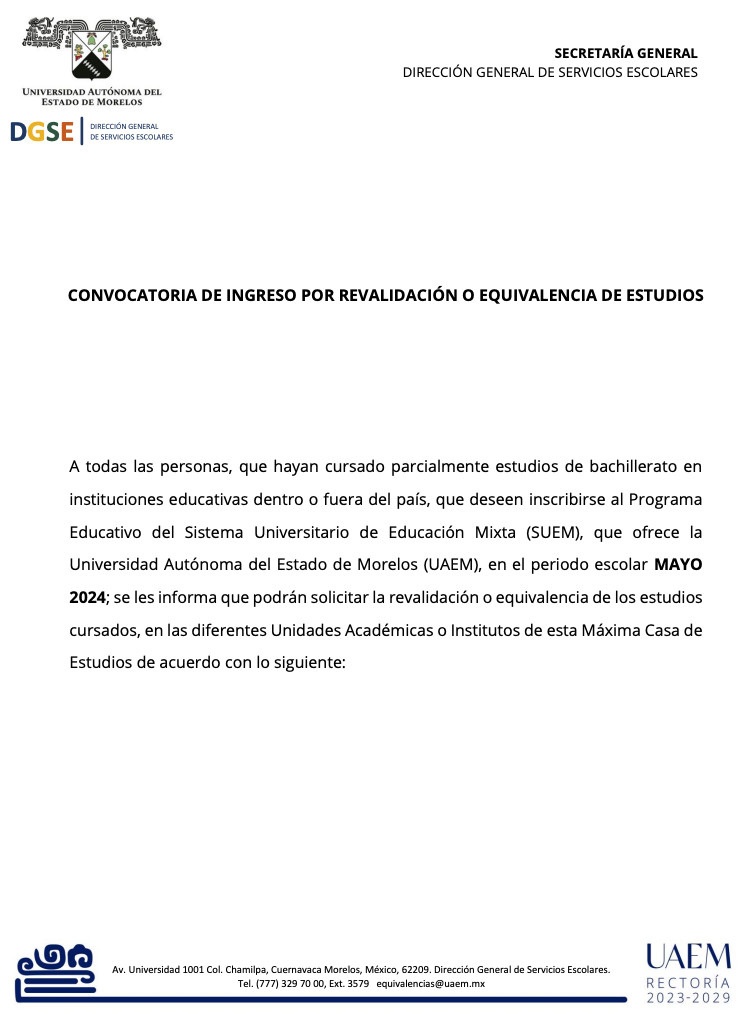CONVOCATORIA DE INGRESO POR REVALIDACIÓN O EQUIVALENCIA DE ESTUDIOS | PERIODO MAYO - 2024