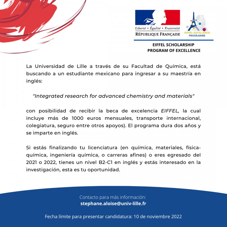 Programa 2023 de Excelencia para BECA EIFFEL y Maestría "Integrated research for advanced chemistry and materials" (Universidad de Lille)