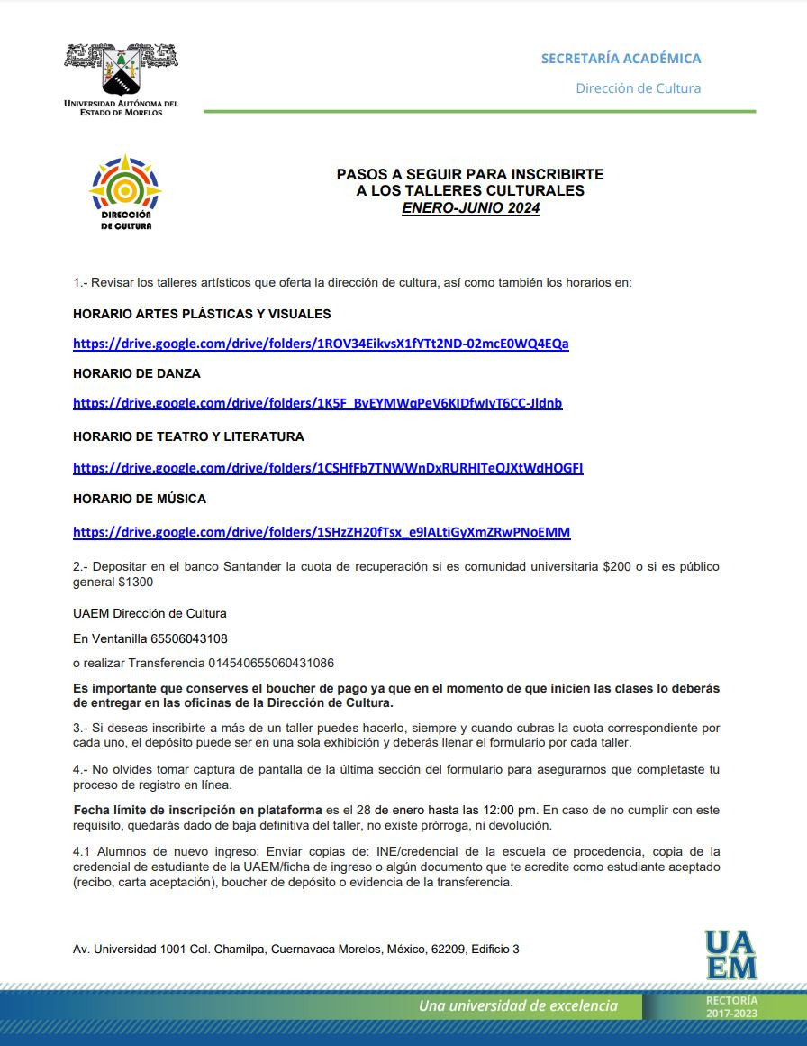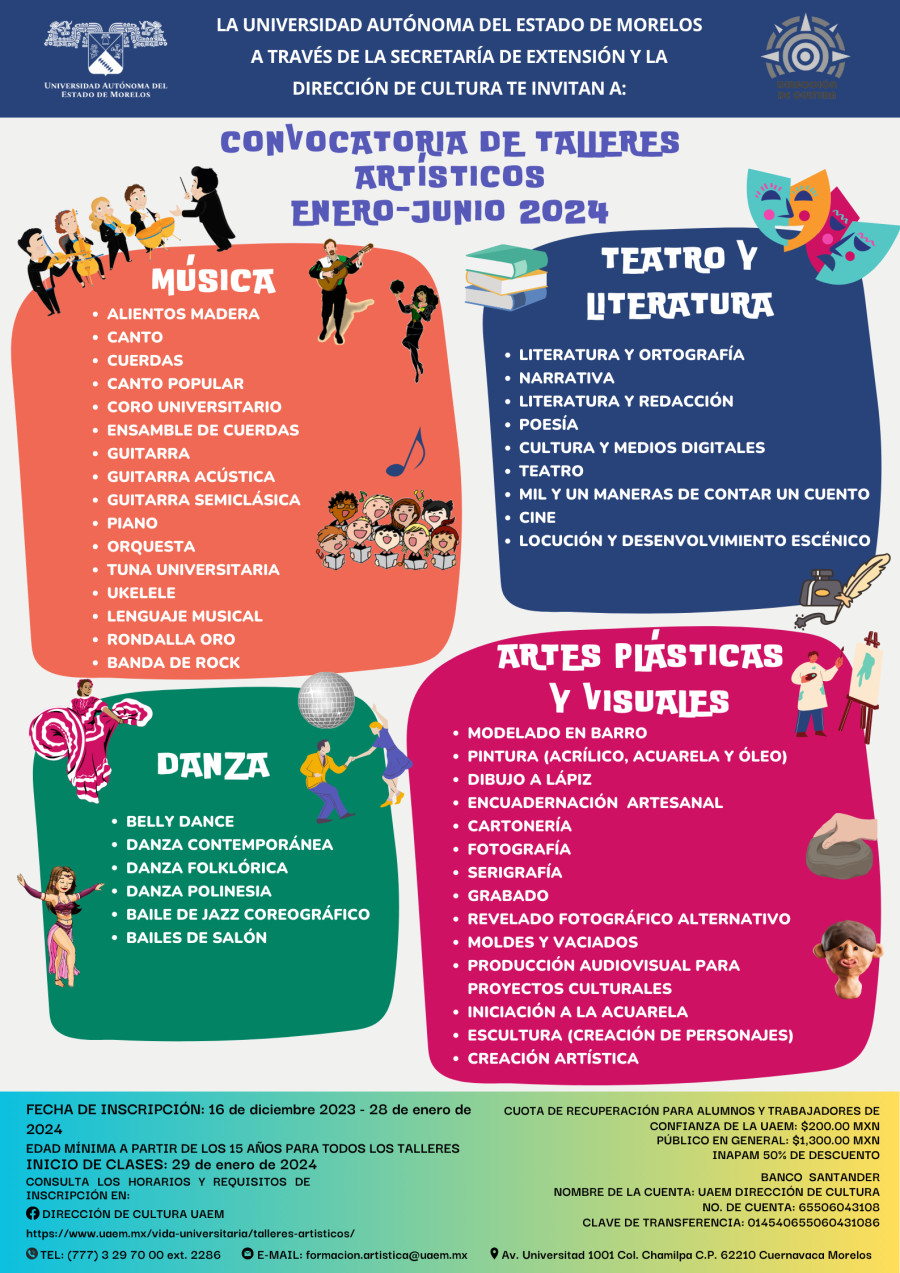 La UAEM ofrece a todos sus estudiantes, trabajadores y público en general talleres artísticos que tienen como objetivo la formación integral, el desarrollo armónico y coherente de la dimensión corporal, cognitiva, comunicativa y emotiva.
